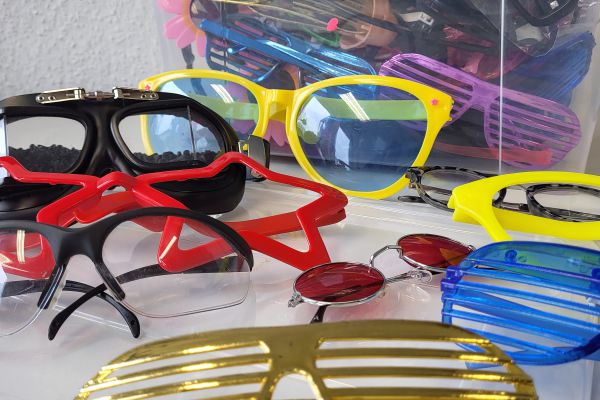 1 Kiste mit verschiedenen Brillen verschiedener Größen und Formen.