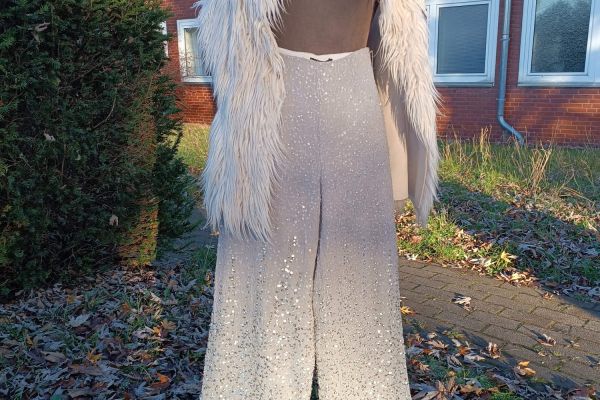 graue Palliettenhose (gr. 34/36, Taille: 72cm), weisse Kunstfellweste (onesize)