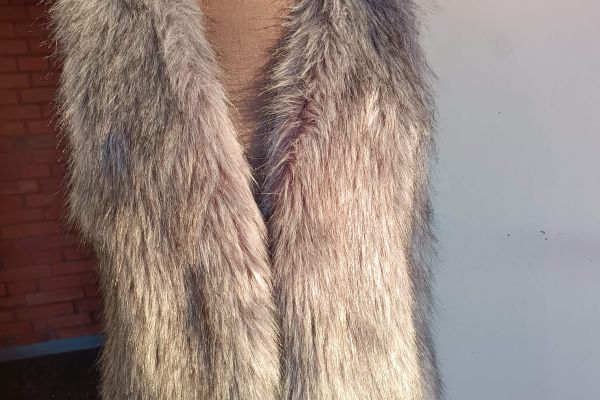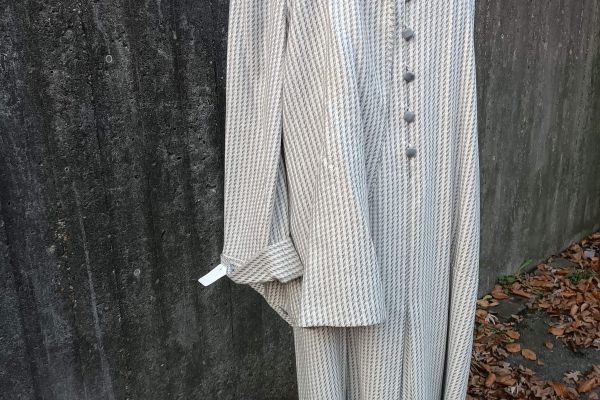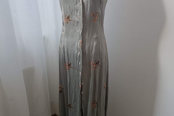 Hellgraues ärmelloses Kleid mit langer Jacke.