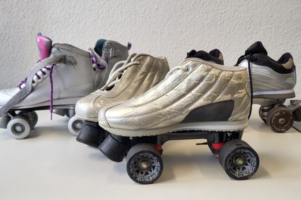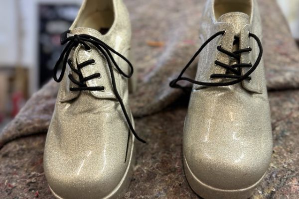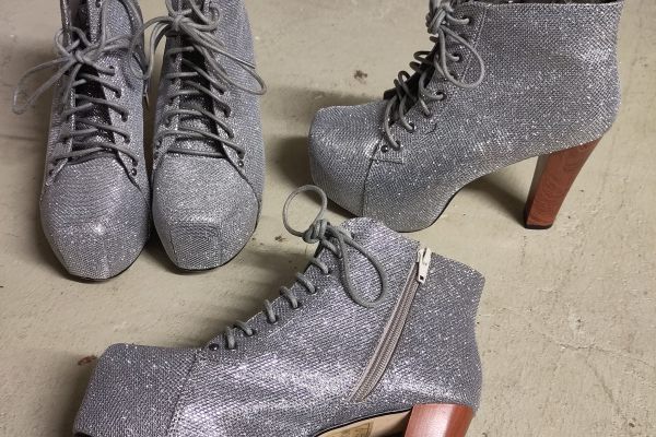 Ein Plateau-Absatzschuh mit grau-glitzernder Oberfläche. Kann geschnürrt werden.