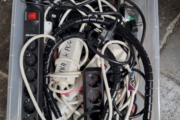 Eine Kiste mit unterschiedlichen Mehrfachtseckdosen.