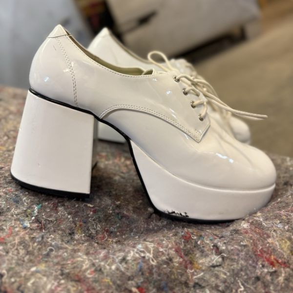 Dieser weiße Absatzschuh wurde von einem Performer mit Schuhgröße 44/45 getragen. Der Schuh hat ungefähr eine Länge von 28/29cm.