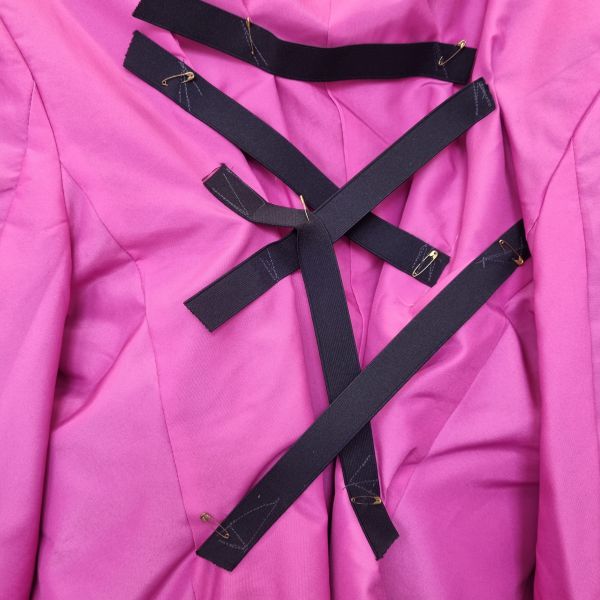 Auf den Rücken gerafft, festgenäht, kann man aber wieder auftrennen.
