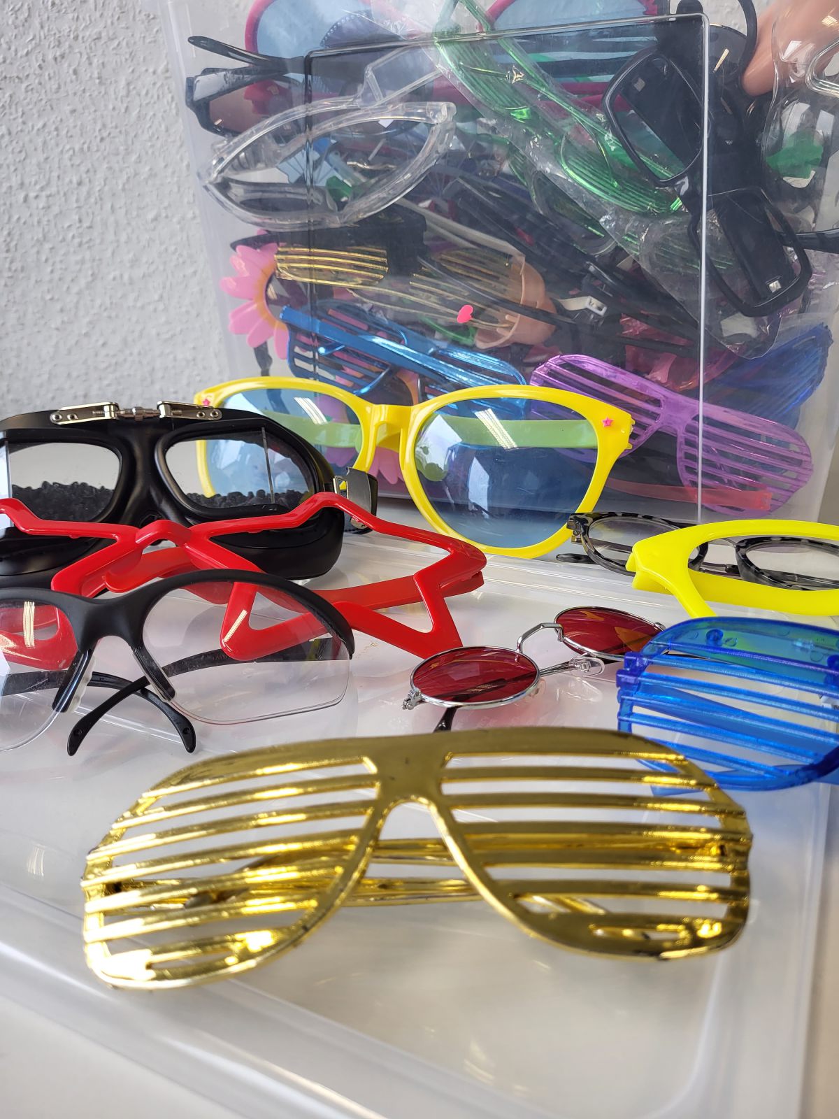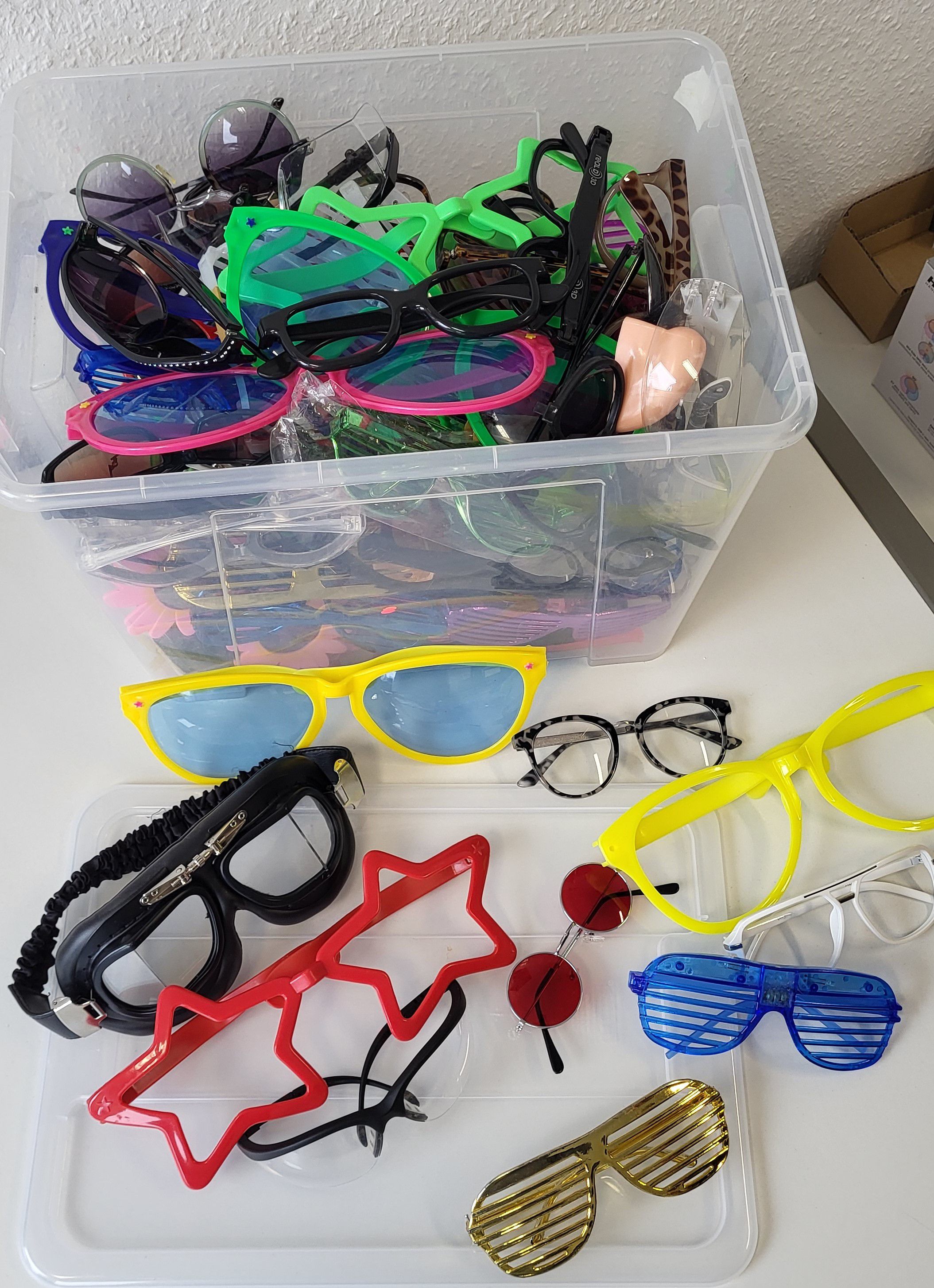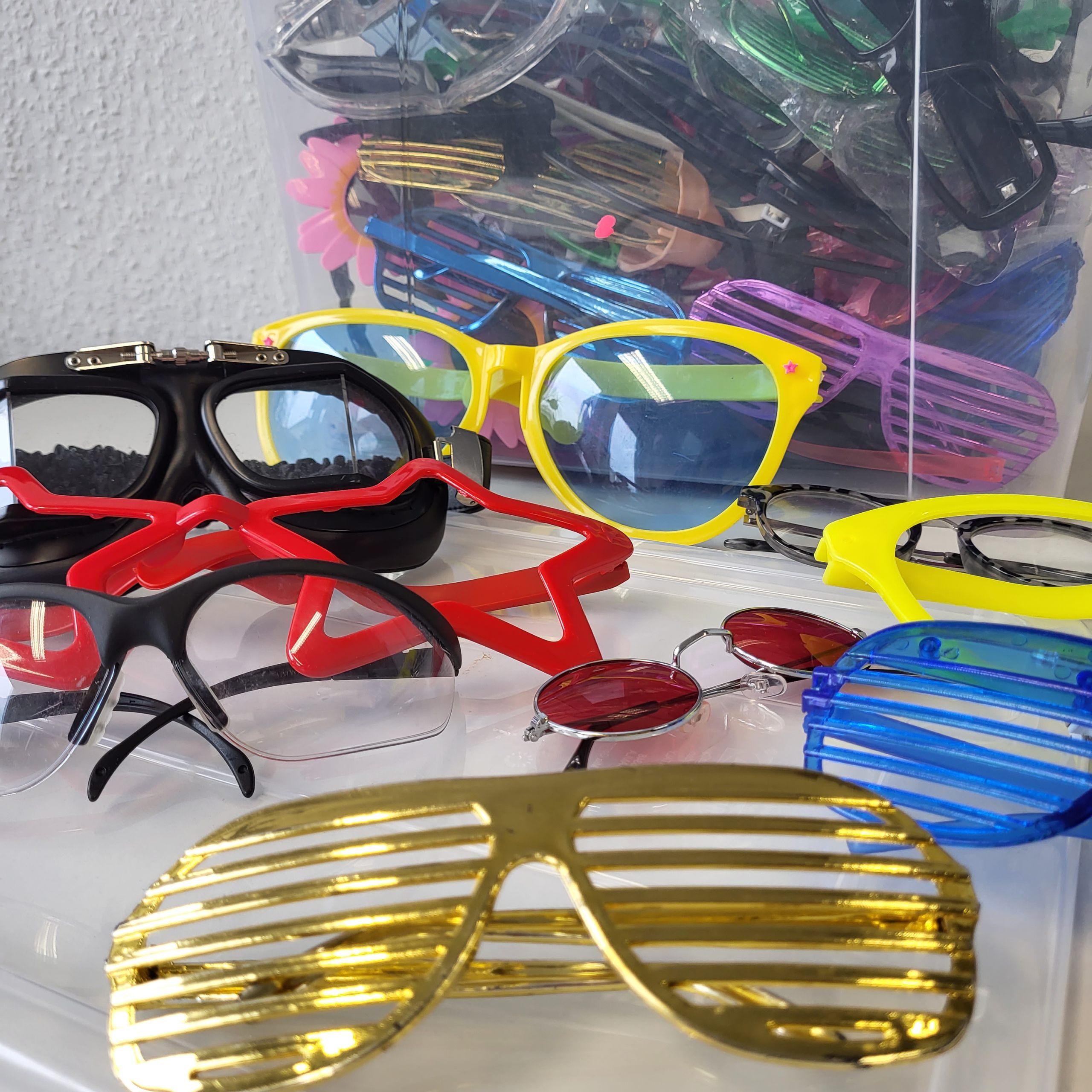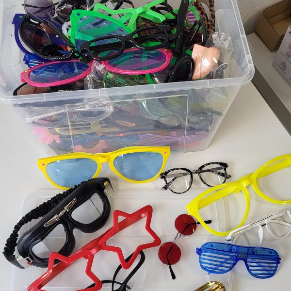 1 Kiste mit verschiedenen Brillen verschiedener Größen und Formen.