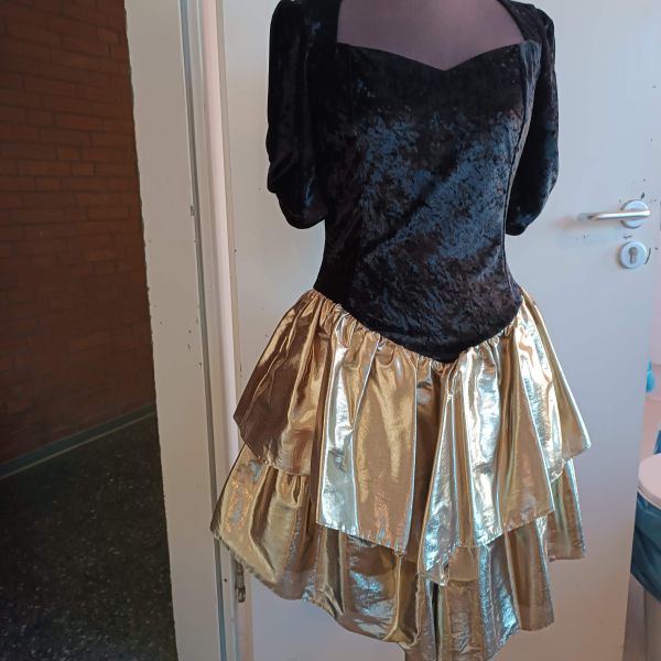 Oberteil Pannesamt schwarz, Rock goldfarben.