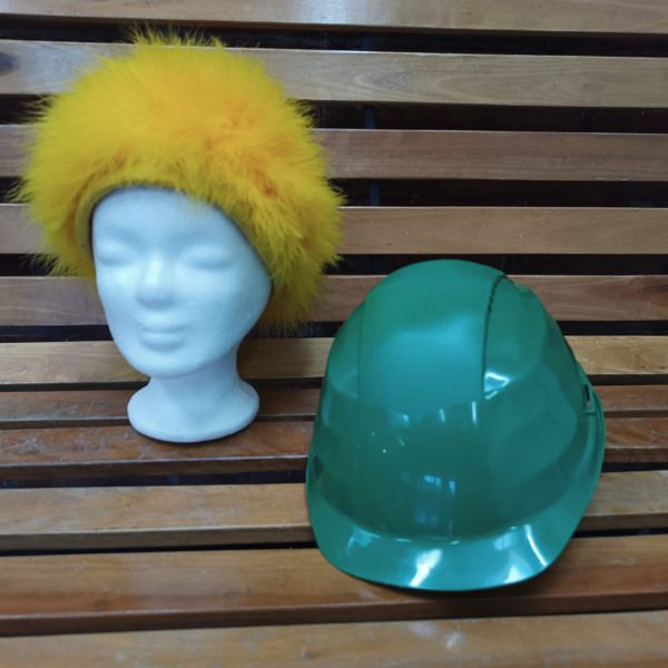 Gelbe Federboa-Mütze und grüner Bauhelm