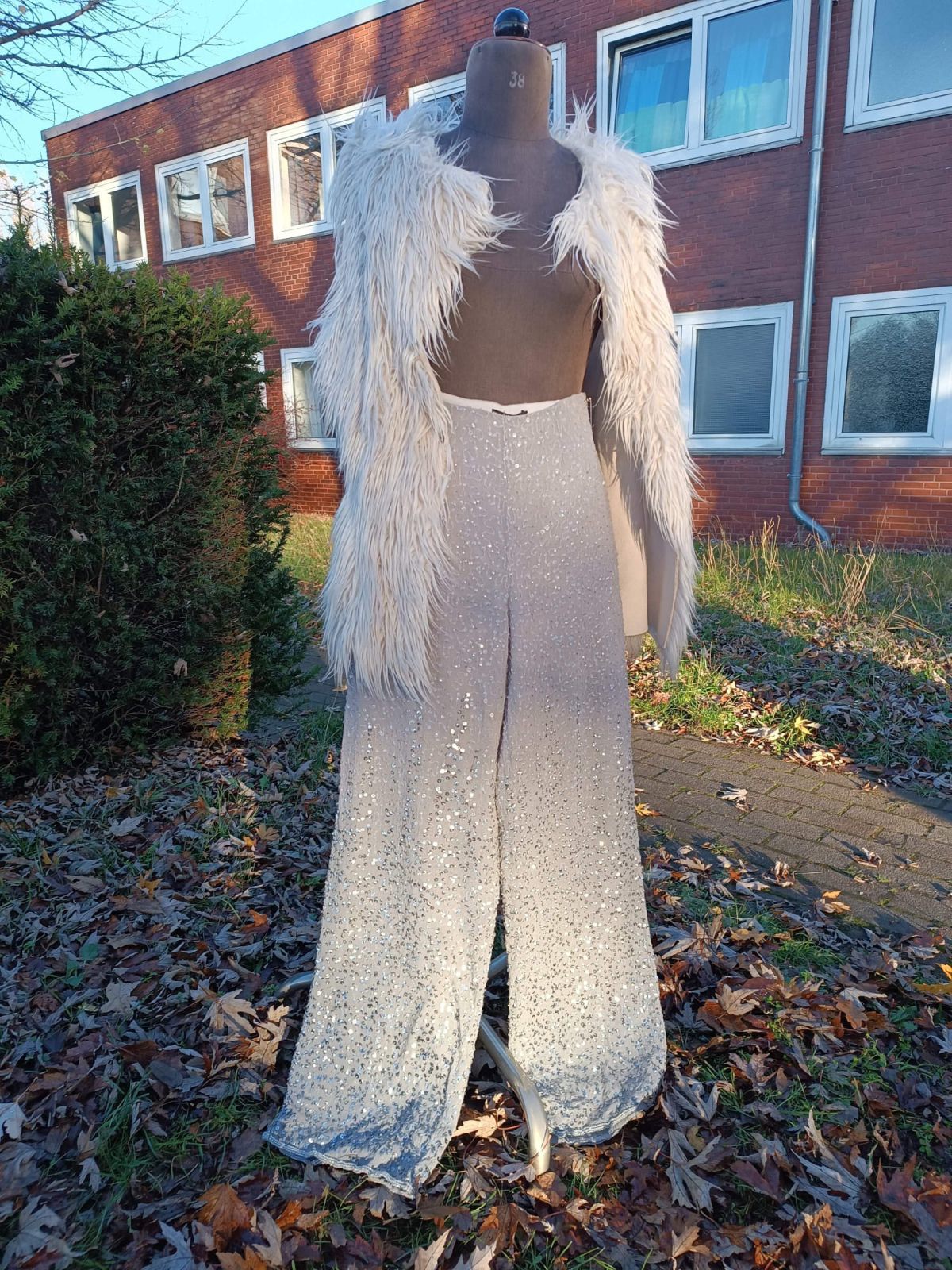 graue Palliettenhose (gr. 34/36, Taille: 72cm), weisse Kunstfellweste (onesize)