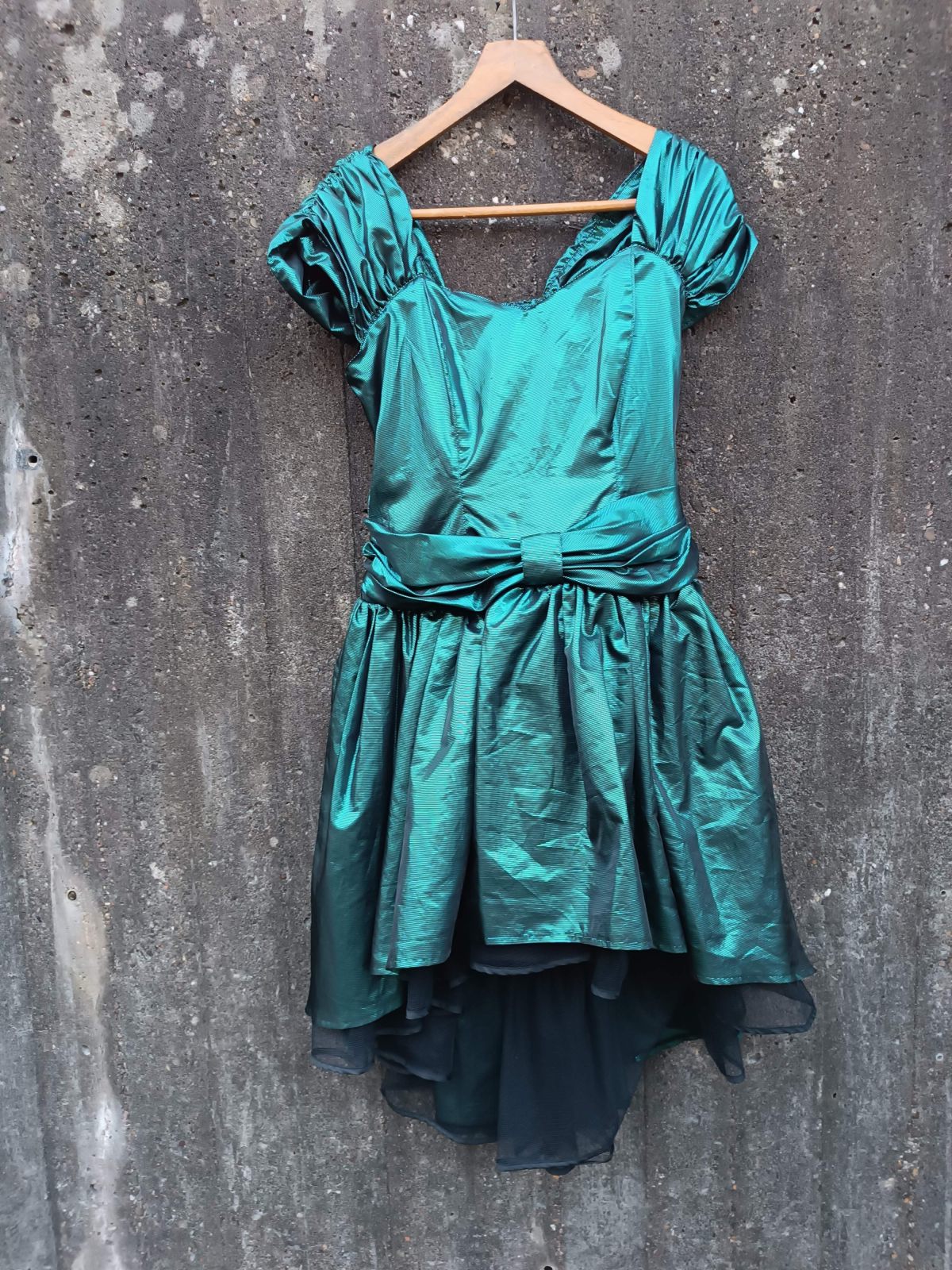 Kurzes Cocktail Kleid aus glänzendem grünen Material.