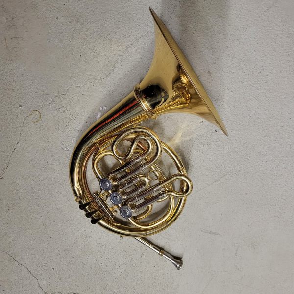 Hinweis: Es handelt sich um ein Instrument für Linkshänder*innen. Das Horn ist eher als Requisit und weniger als funktionstüchtiges Instrument geeignet, man kann ihm aber Töne entlocken.