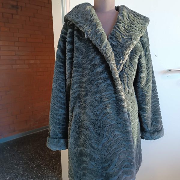 Kunstpelz Mantel mit Kapuze. Grau meliert.
