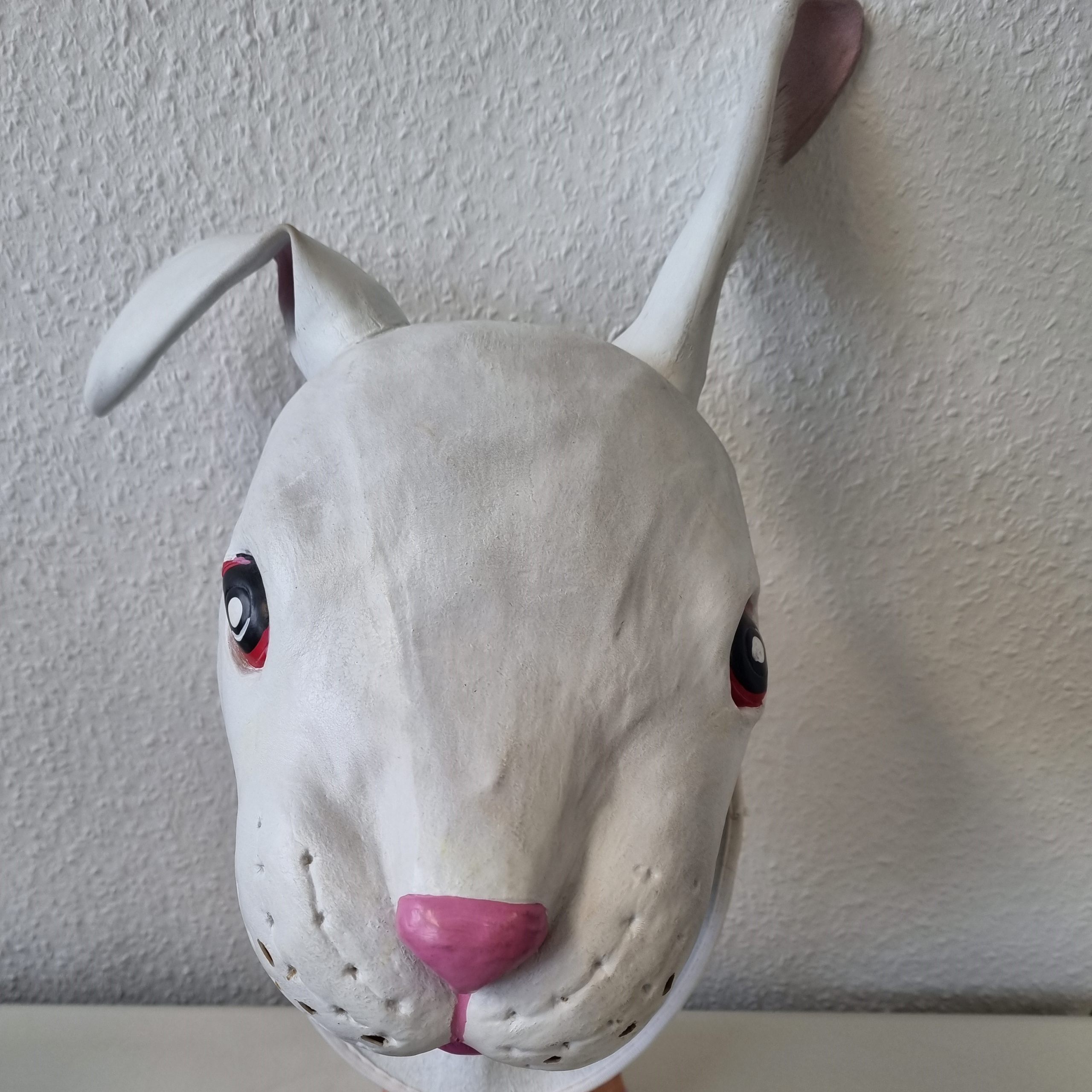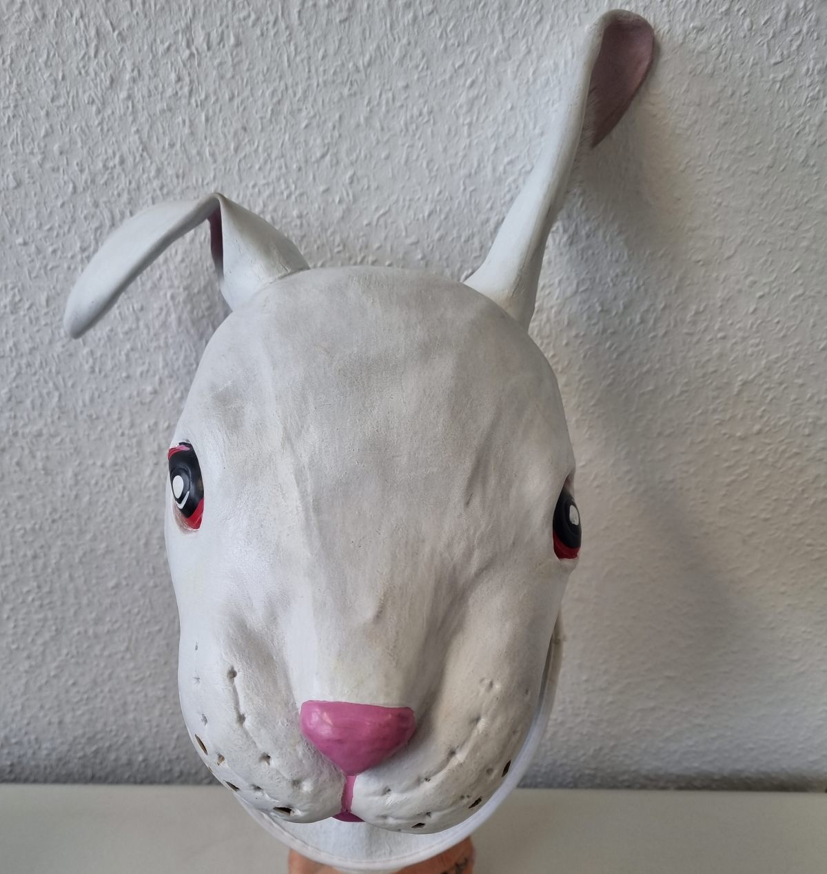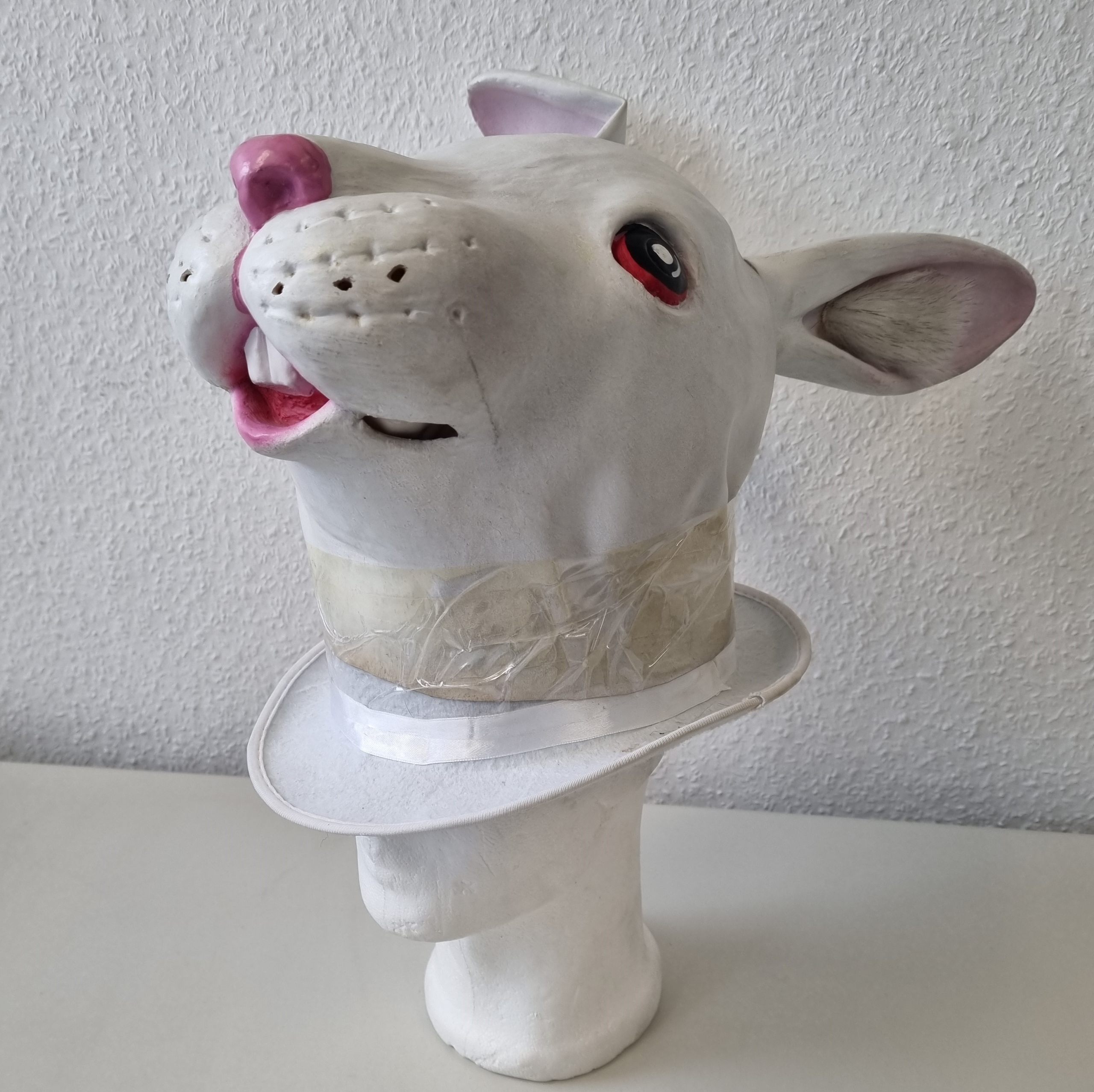 Hinweis: Aktuell ist die Maske auf einen Hut geklappt und kann als Hasenhut getragen werden. Kann aber auch vom Hut getrennt werden, ist nur geklebt.
