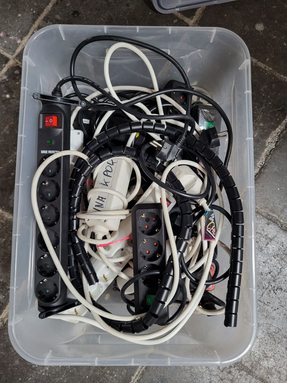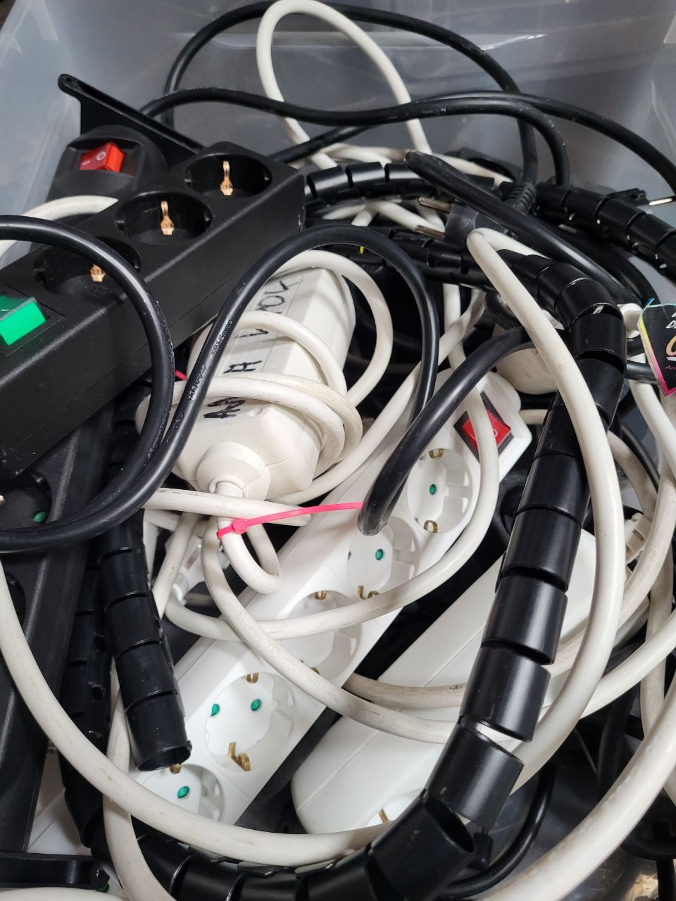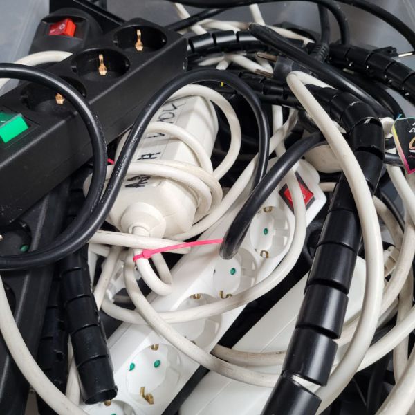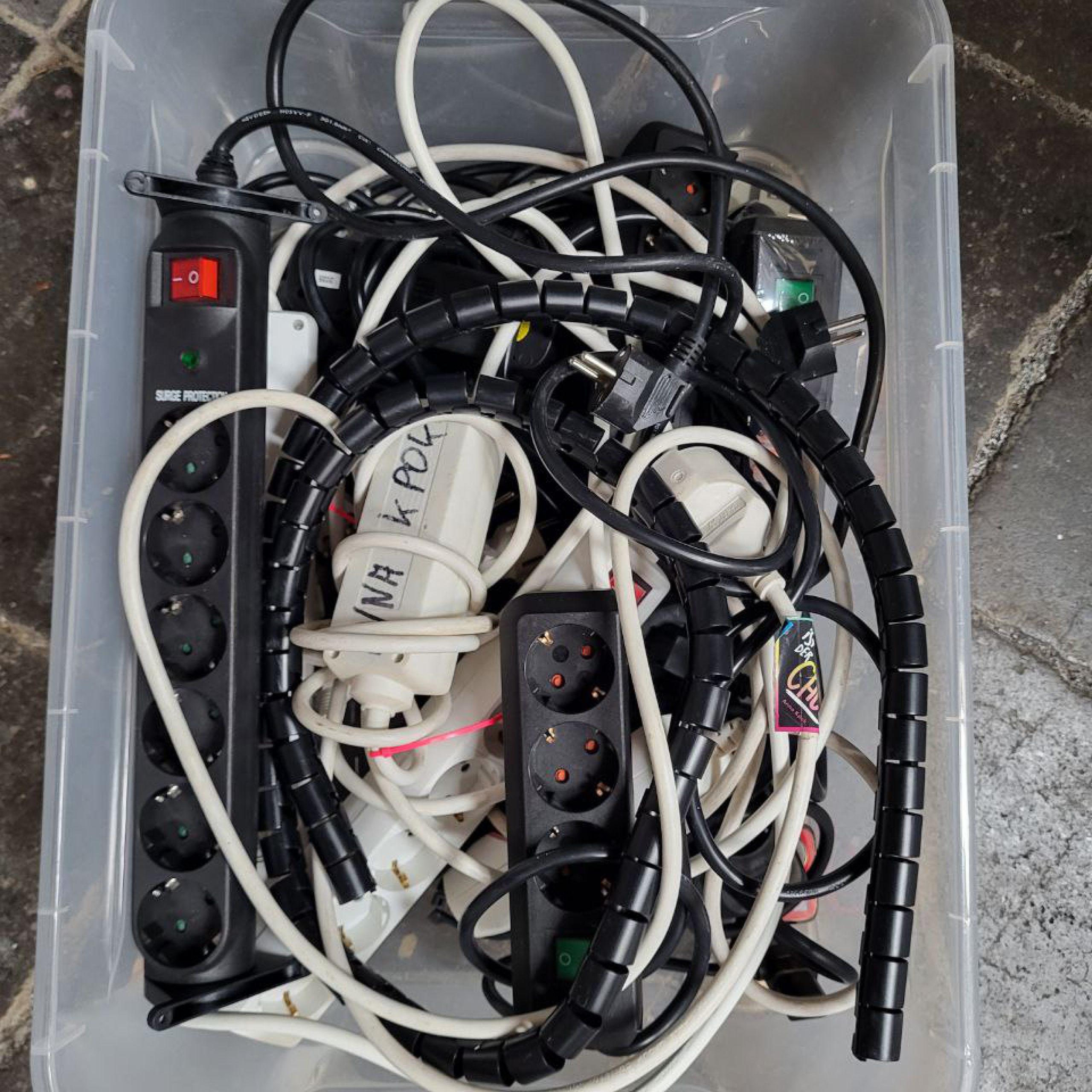Eine Kiste mit unterschiedlichen Mehrfachtseckdosen.