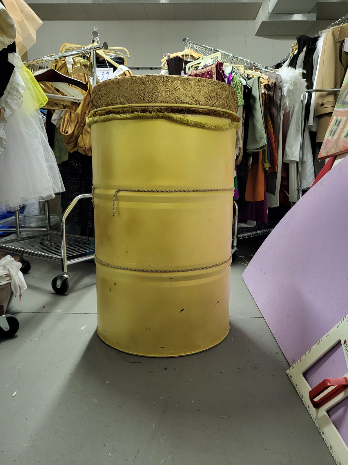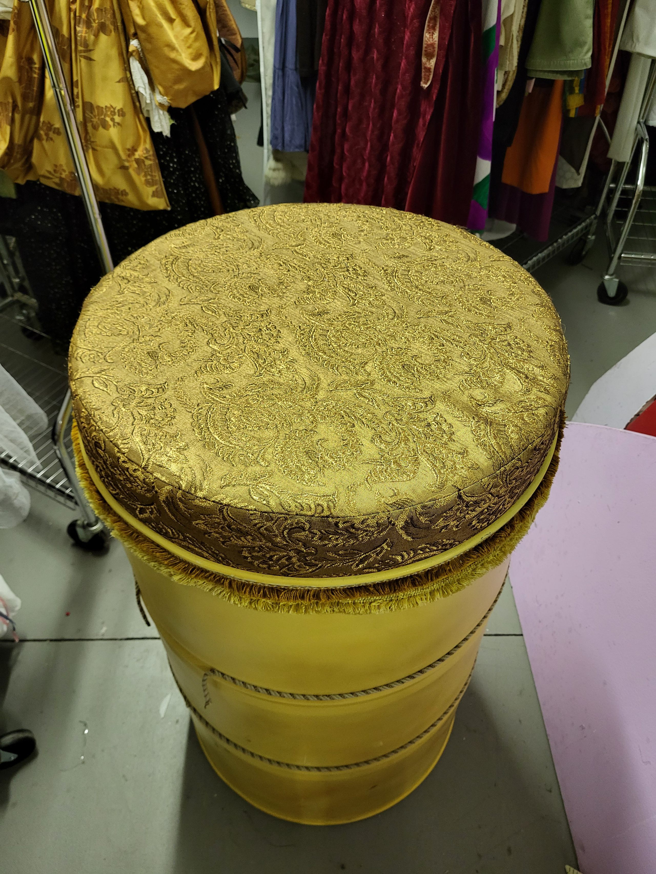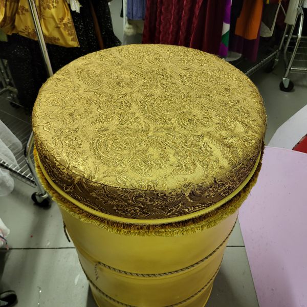 Farbe: gold, Polsterstoff orientalisch gold/glitzer Material: Tonne: Blech/Polster: Polyester Maße: Höhe 95cm/Durchmesser 55cm