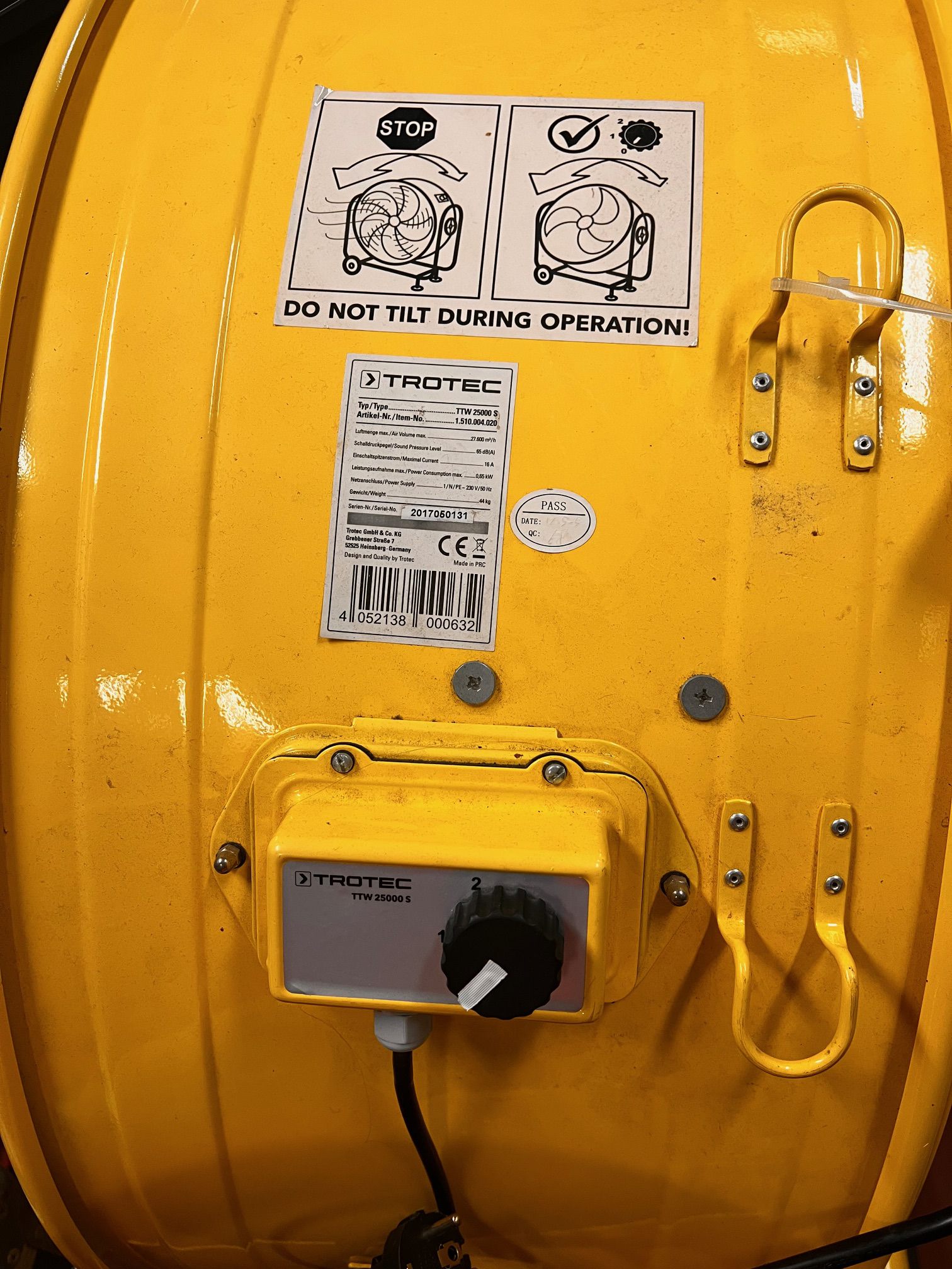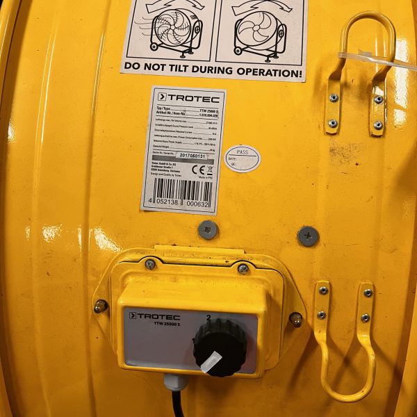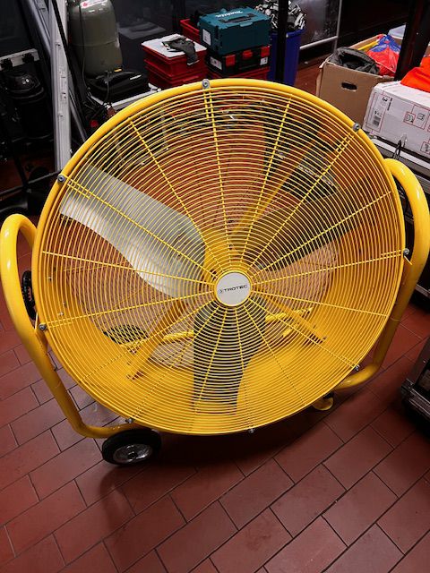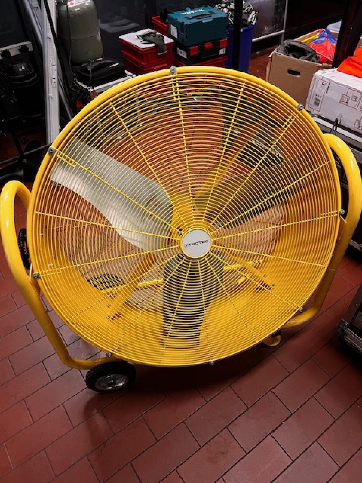 Eine leistungsstarke, gelbe Windemaschine der Firma Trotec. Etwas 1,20m Durchmesser. Typ TTW 25000s. Hat zwei Stärken zur Auswahl, kann bei Bedarf auch an einen vorhandenen Handdimmer angeschlossen werden.