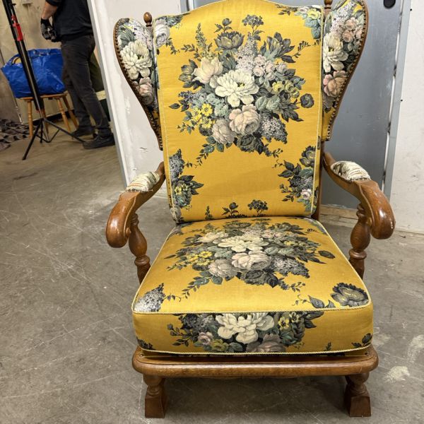 Ein Vintage Ohrensessel mit Blumenmuster auf den Kissen. Die Kissen können mit Druckknöpfen befestigt oder entfernt werden.