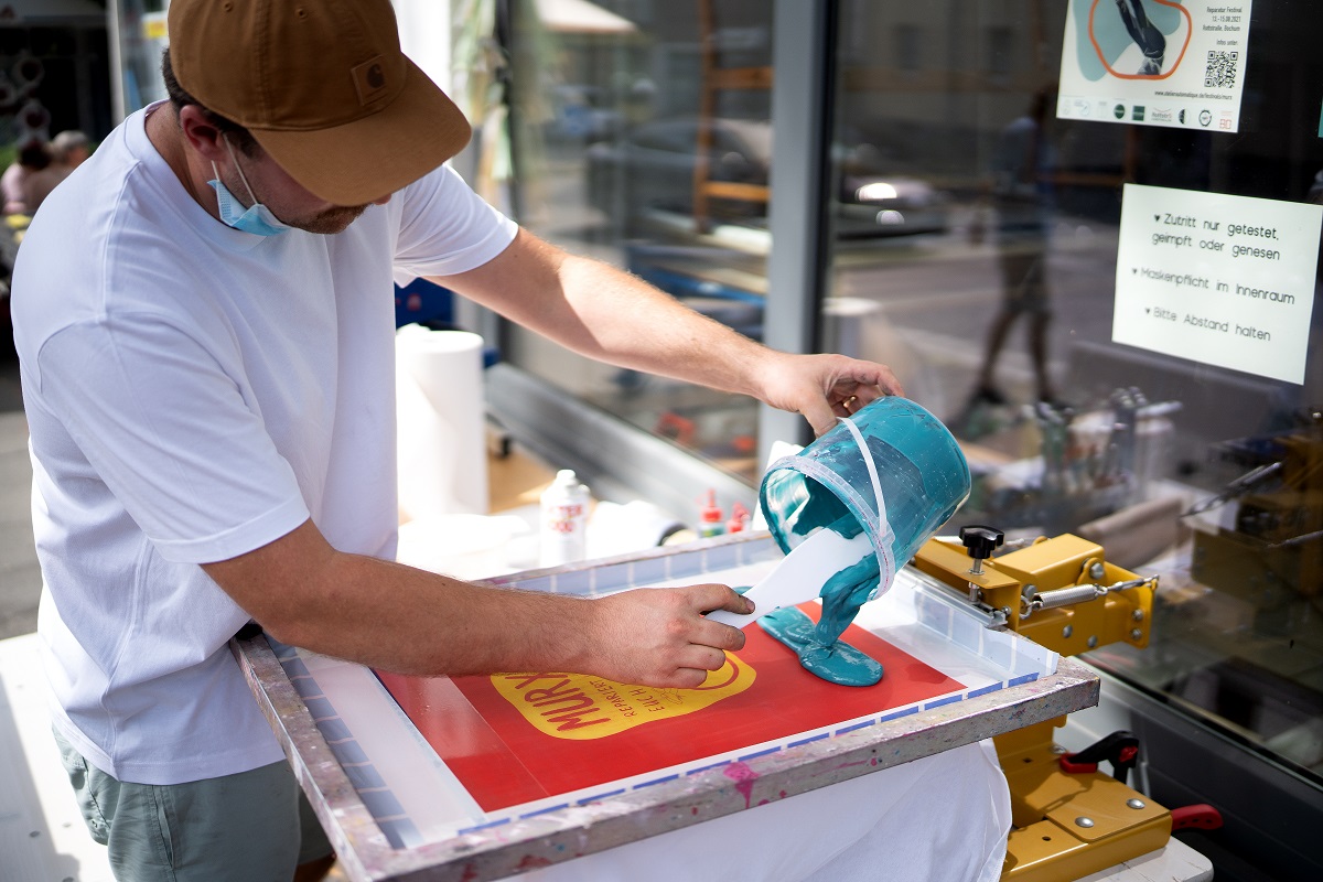 Wir sind keine Siebdruck-Profis, aber leiten dich gern an und drucken mit dir gemeinsam das Motiv per Siebdruck auf.