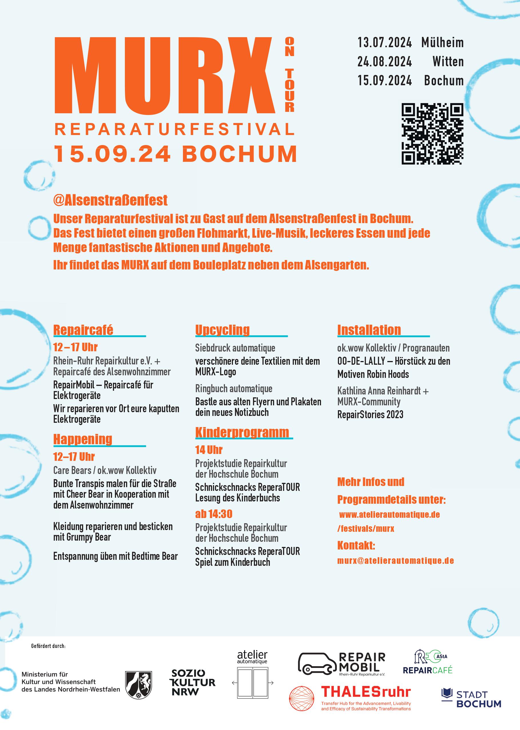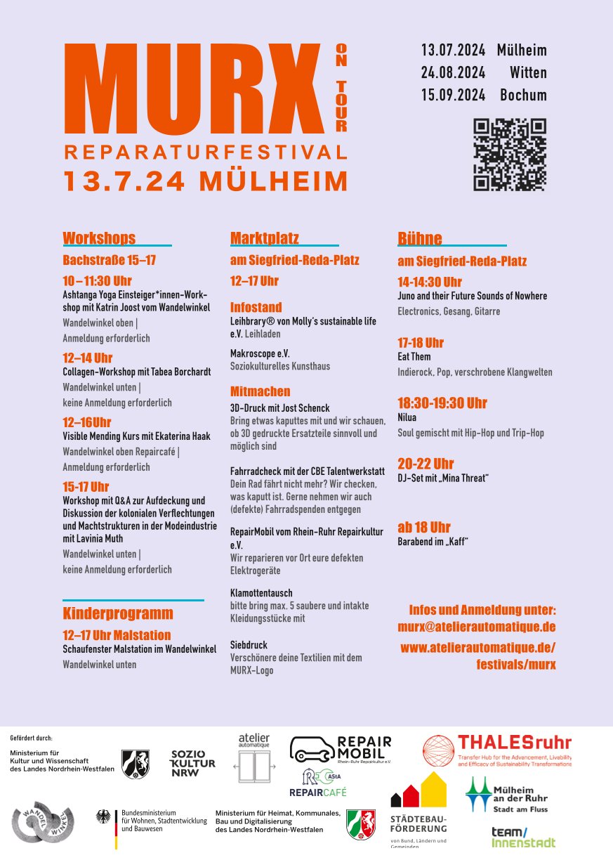 Das Reparaturfestival MURX, welches seit 2021 regelmäßig im ViktoriaQuartier in Bochum stattfindet, und das frisch eingerichtete RepairMobil gingen 2024 gemeinsam auf Tour durch die Metropole Ruhr. In Kooperation mit der Hochschule Bochum (THALESruhr) sowie weiteren Zukunftskünstler*innen entwickelten wir ein flexibles und mobiles Festivalformat, bei dem Kunst und Nachhaltigkeit Hand in Hand gehen. Wir wollen gemeinsam die Reparaturkultur fördern und Menschen zusammenbringen, um durch Skill-Sharing, Hilfe zur Selbsthilfe sowie künstlerische Experimente aktiv die Zukunft mitzugestalten, ganz getreu dem MURX-Motto: repariert, was euch kaputt macht!